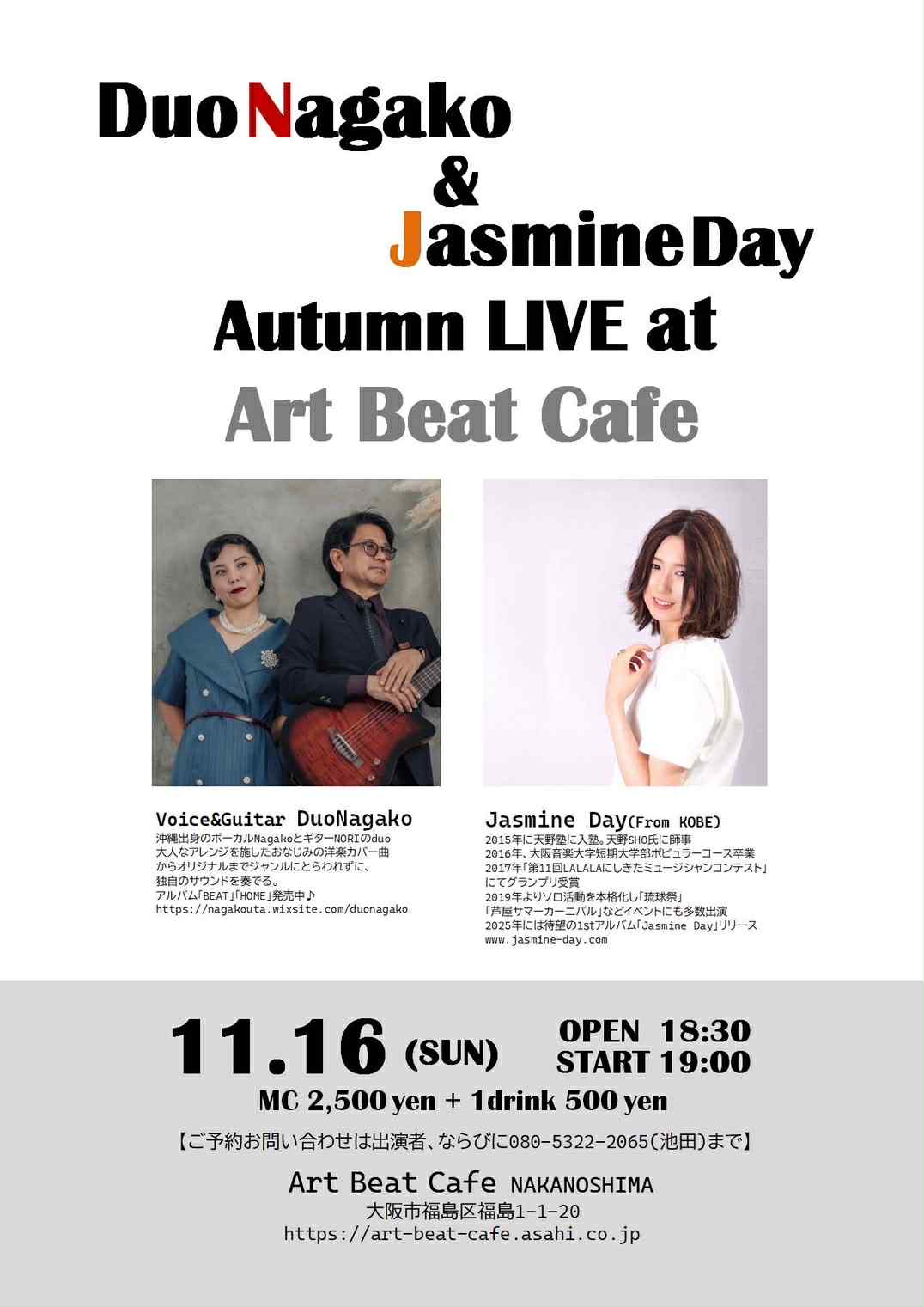 2025 11.16[sun] Duo Nagako & Jasmine Day Autum Live ARTIST Duo Nagako Jasmine Day INFO チケット料金は消費税込み、1ドリンク代を含みます OPEN 18:30 START 19:00 PRICE ¥3,000 VIEW MORE