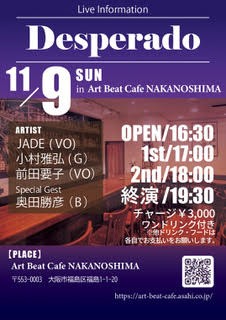 2025 11.09[sun] Desperado Almini Meeting ARTIST Vo..JADE , Vo.前田要子 Gt 小村雅弘 Bs 奥田勝彦 INFO チケット料金は消費税込み、1ドリンク代を含みます OPEN 16:30 START 17:00 PRICE ¥3,000 VIEW MORE